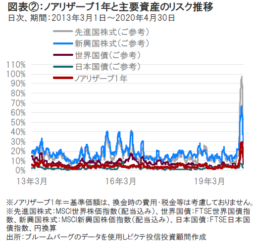 ノアリザーブ1年の設定来のリスクは、株式等と比較すると相対的に低位に推移してきました。新型コロナウイルスの影響で金融市場の価格変動が大きくなる中、当ファンドのリスク(価格変動)も大きくなっていますが、3月に比べると4月は低下しました。(図表②参照)