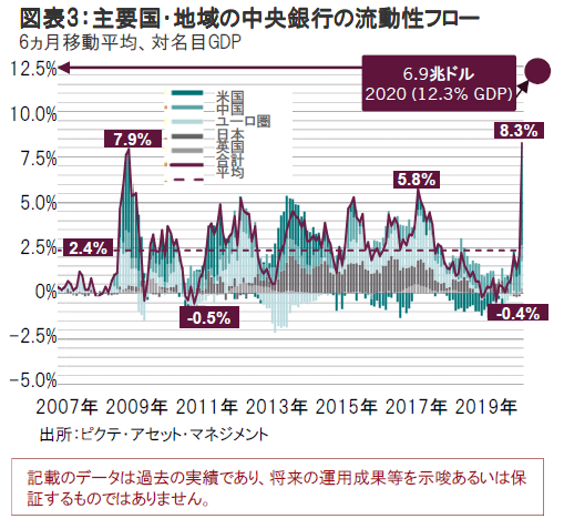 世界の中央銀行は、前例のない巨額の資金を金融システムに注入しています。2019年末以降、FRBだけでGDP比500ベーシス・ポイント(5%)相当の金融緩和を行っており、半分弱が利下げを通じて、残りの半分強が資産購入の形で行われています。(図表3参照)FRBは、必要ならば、追加緩和を行う態勢を整えています。ピクテのモデルは、同900ベーシス・ポイント(9%)の利下げ相当の金融緩和が行われる可能性を示唆していますが、これは、(グローバル金融危機を含む2014年までの)7年間に行われた金融緩和の総額を上回ります。