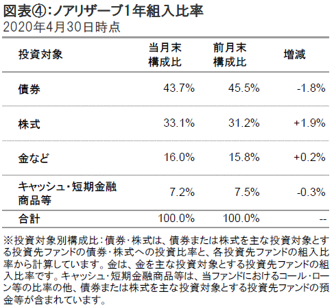 2020年4月のノアリザーブ1年の基準価額は上昇しました。新型コロナウイルスの感染拡大による都市封鎖などからの経済活動再開への期待から株式市場が急反発、金融緩和の継続などを受けて債券や金も上昇しました。資産配分では、債券の組入れを引き下げ、株式の組入れ比率を引き上げました。
