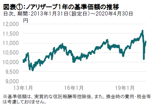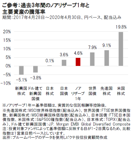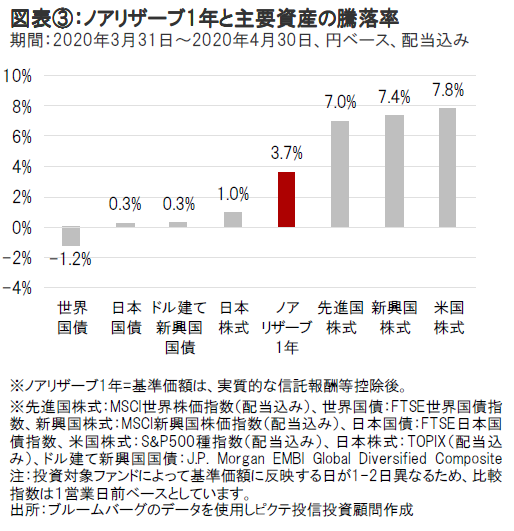 2020年4月は、世界の株式市場が米国株式を中心に反発した一方、円ベースで見ると為替の円高が影響し世界国債は下落しました。このような状況下、ノアリザーブ1年は上昇しました。(図表③参照)