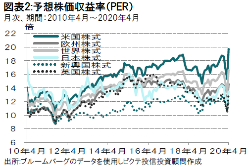 米国は、12ヵ月先の利益予想を用いて算出した株価収益率(PER)は、3月下旬の13倍台から4月末には19倍台と18年ぶりの水準に上昇しており(図表2参照)、世界の市場の中で最も割高な市場の一つとなっています。