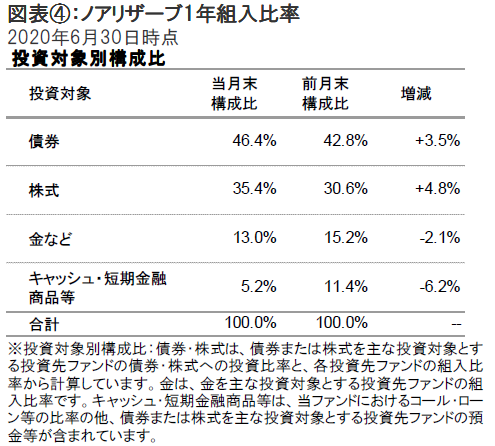 2020年6月のノアリザーブ1年の基準価額は上昇しました。世界経済の回復期待や米国などによる金融緩和策の継続を背景にリスク資産に資金が流入しました。資産配分では、キャッシュと金の組入れを引き下げ、株と債券の組入れ比率を引き上げました。