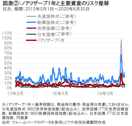ノアリザーブ1年の設定来のリスクは、株式等と比較すると相対的に低位に推移してきました。当ファンドのリスク(価格変動)水準は、新型コロナウイルスの影響で金融市場の価格変動が大きくなった3月よりも大幅に低下していますが、新型コロナウイルス感染拡大前よりは高い水準となっています。(図表②参照)