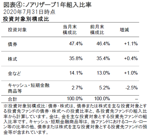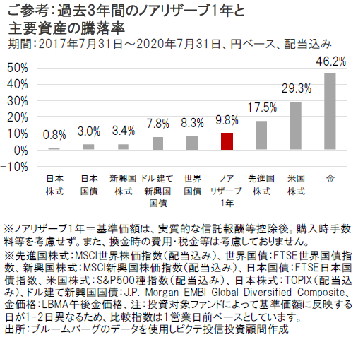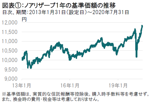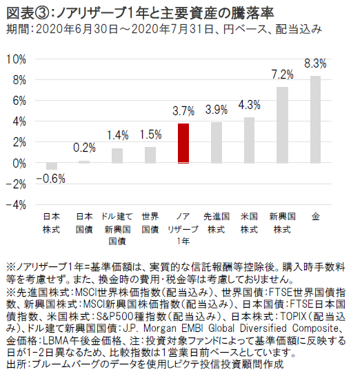 2020年7月は、金や日本を除く世界の株式市場が堅調となった一方、日本株式は下落しました。このような状況下、ノアリザーブ1年の基準価額は上昇しました。(図表③参照)