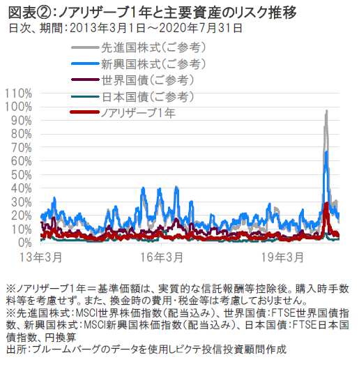ノアリザーブ1年の設定来のリスクは、株式等と比較すると相対的に低位に推移してきました。当ファンドのリスク(価格変動)水準は、新型コロナウイルスの影響で金融市場の価格変動が大きくなった3月よりも大幅に低下、新型コロナウイルス感染拡大前よりも小幅に高い水準での推移となっています。(図表②参照)