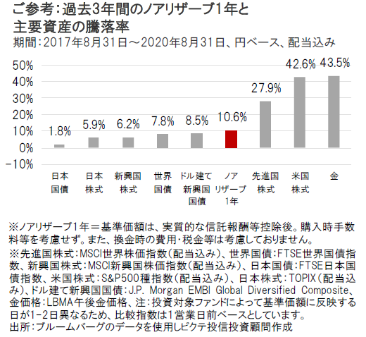 ノアリザーブ1年の設定来のリスクは、株式等と比較すると相対的に低位に推移してきました。当ファンドのリスク(価格変動)水準は、新型コロナウイルスの影響で金融市場の価格変動が大きくなった3月よりも大幅に低下しましたが、新型コロナウイルス感染拡大前よりも高い水準での推移となっています。(図表②参照)