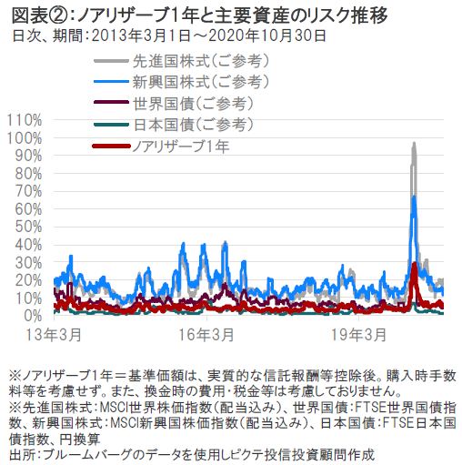ノアリザーブ1年の設定来のリスクは、株式等と比較すると相対的に低位に推移してきました。当ファンドのリスク(価格変動)水準は、新型コロナウイルスの影響で金融市場の価格変動が大きくなった3月よりも大幅に低下しましたが、新型コロナウイルス感染拡大前よりも小幅に高い水準での推移となっています。(図表②参照)