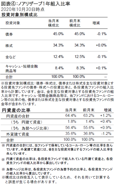 2020年10月のノアリザーブ1年の基準価額は下落しました。欧米における新型コロナウイルスの感染再拡大や米国の追加経済対策を巡る不透明感などを受けて先進国の株式市場は下落しました。また金、世界国債も軟調な動きとなりました。一方、新興国株式は上昇しました。資産配分は、概ね前月の組入比率を維持しました。
