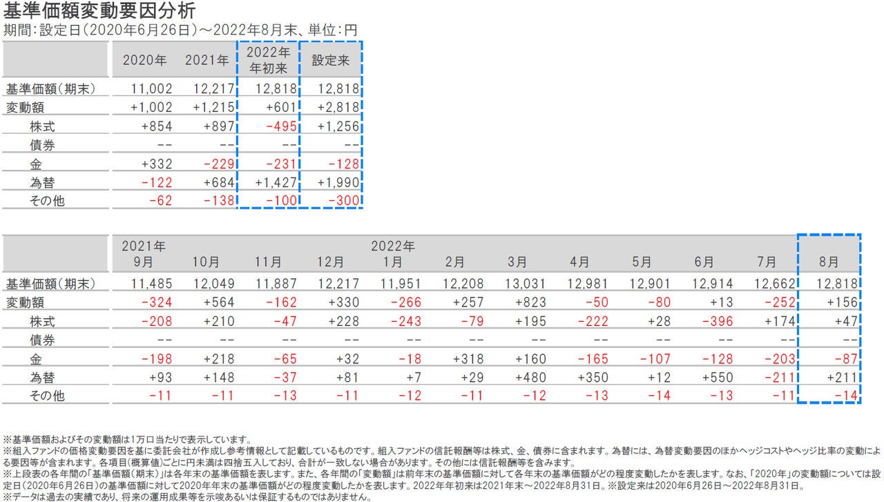 2022年8月は、金がマイナス寄与となった一方、株式、為替がプラス寄与となり、基準価額は上昇しました。