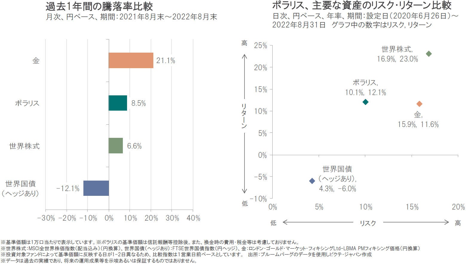 ポラリスの基準価額は過去1年間(2021年8月末~2022年8月末)では8.5%の上昇となりました。ポラリスの設定来の年率のリスク(標準偏差)とリターンはそれぞれ10.1%、12.1%となっています。