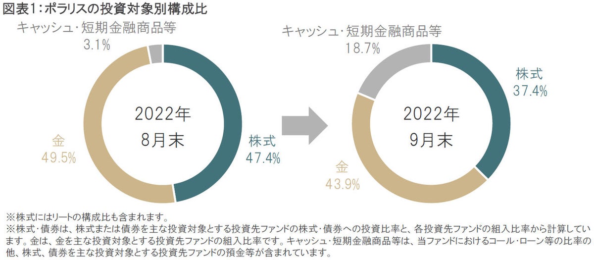 しかし足元、世界的なインフレの高進と各国・地域の中央銀行による金融引き締めの動き、欧州のエネルギー問題、地政学リスクなどを背景に世界経済の先行き懸念が高まり、世界の金融市場が不安定な動きとなる中、2022年9月にポラリスは戦術的に資産配分の見直しを行い、株式と金の組入比率を引き下げ、キャッシュ・短期金融商品等の組入比率を引き上げました(図表1参照)。