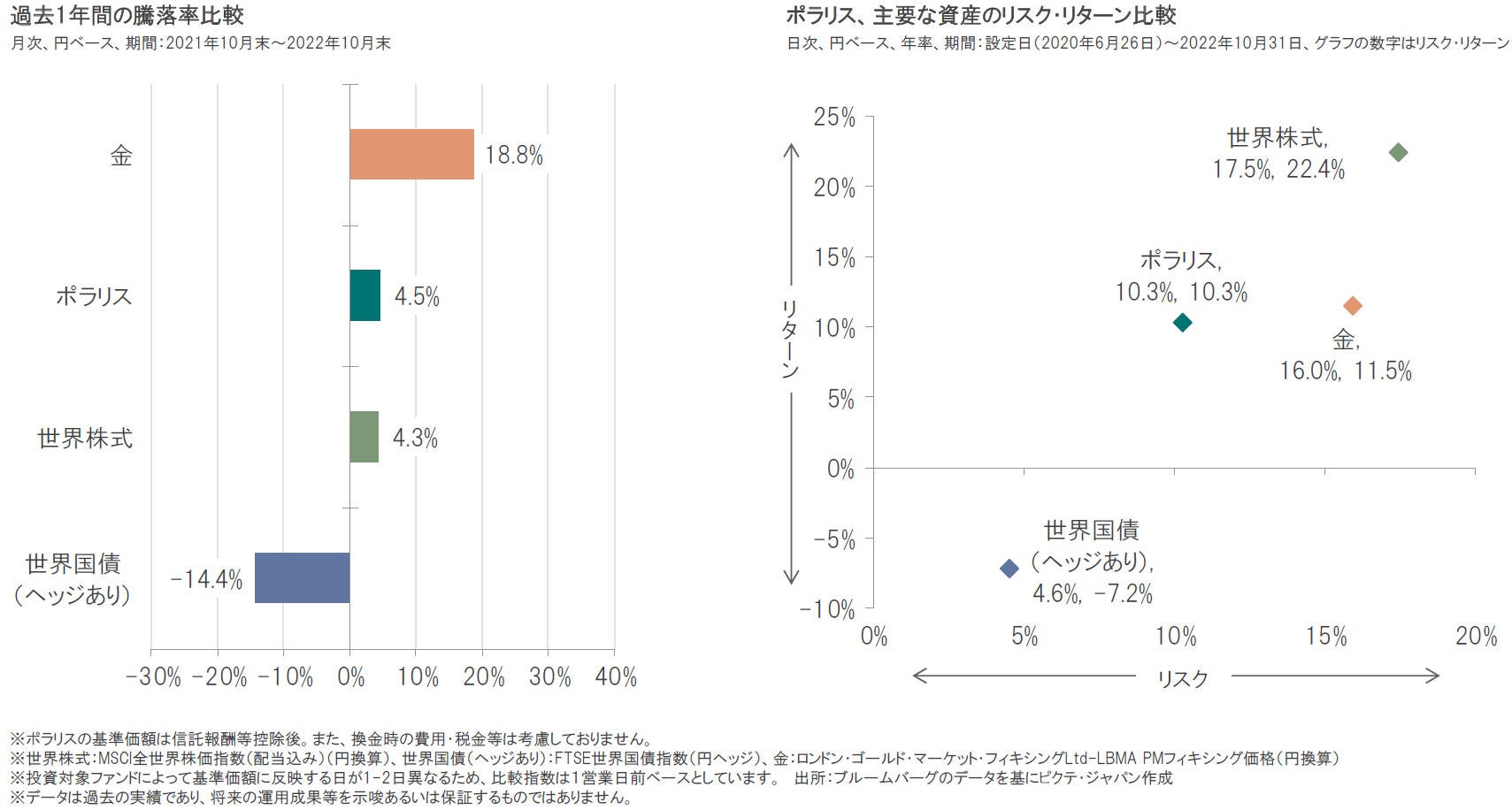 ポラリスの基準価額は過去1年間(2021年10月末~2022年10月末)では4.5%の上昇となりました。 ポラリスの設定来の年率のリスク(標準偏差)とリターンはそれぞれ10.3%、10.3%となっています。