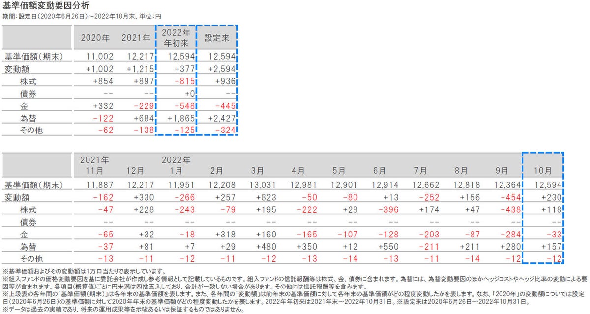 2022年10月は、金がマイナス寄与となりましたが、株式、為替がプラス寄与となり、基準価額は上昇しました。