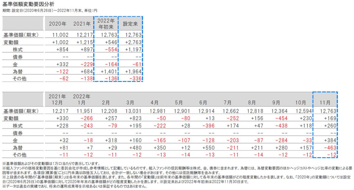 2022年11月は、為替がマイナス寄与となりましたが、株式、金がプラス寄与となり、基準価額は上昇しました。
