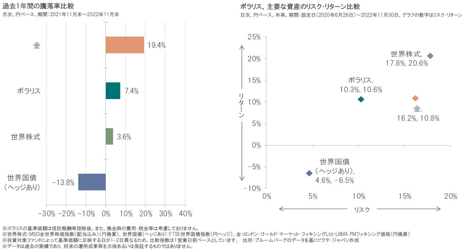ポラリスの基準価額は過去1年間(2021年11月末~2022年11月末)では7.4%の上昇となりました。ポラリスの設定来の年率のリスク(標準偏差)とリターンはそれぞれ10.3%、10.6%となっています。
