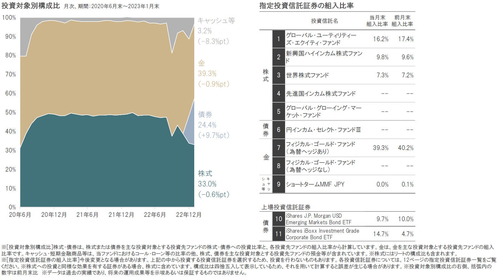 2023年1月末の組入比率は、債券の組入比率を基本資産配分に近い水準まで引き上げた一方、キャッシュ等、金、株式の組入比率を引き下げました。