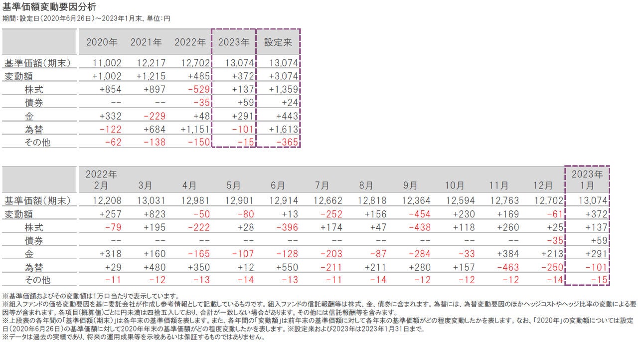 2023年1月は、為替がマイナス寄与となりましたが、株式、債券、金がプラス寄与となり、基準価額は上昇しました。
