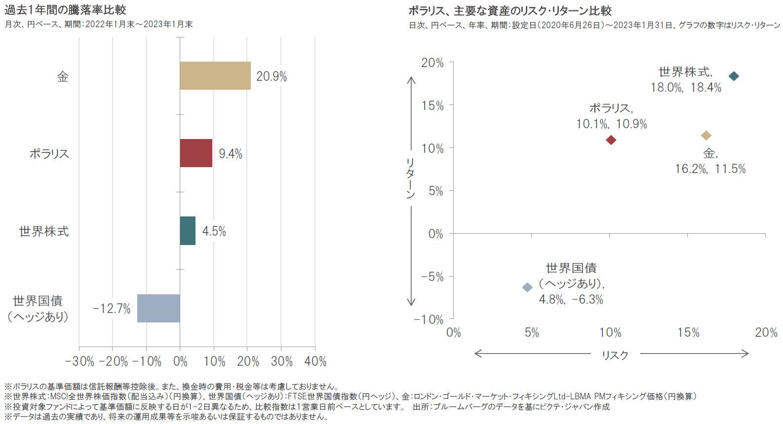ポラリスの基準価額は過去1年間(2022年1月末~2023年1月末)では9.4%の上昇となりました。ポラリスの設定来の年率のリスク(標準偏差)とリターンはそれぞれ10.1%、10.9%となっています。