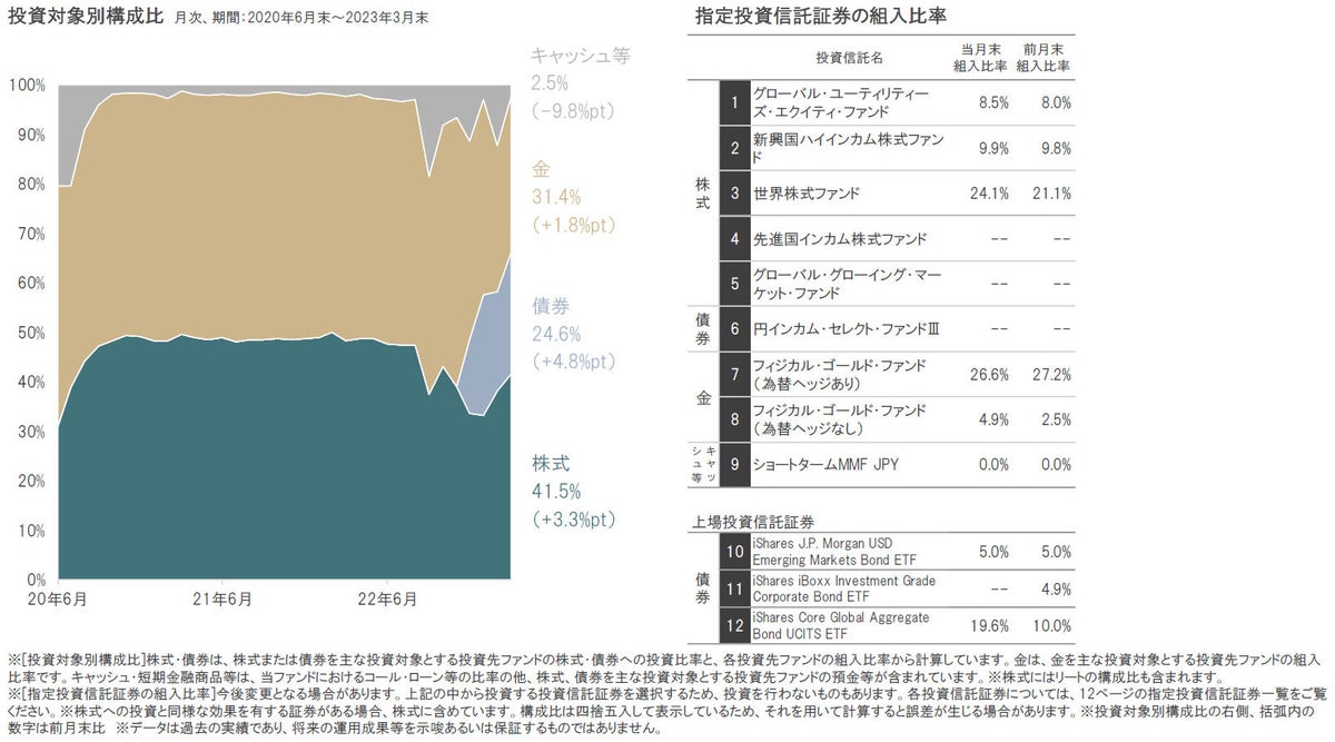 2023年3月末の組入比率は、株式、債券、金の組入比率を引き上げた一方、キャッシュ等の組入比率を引き下げました。