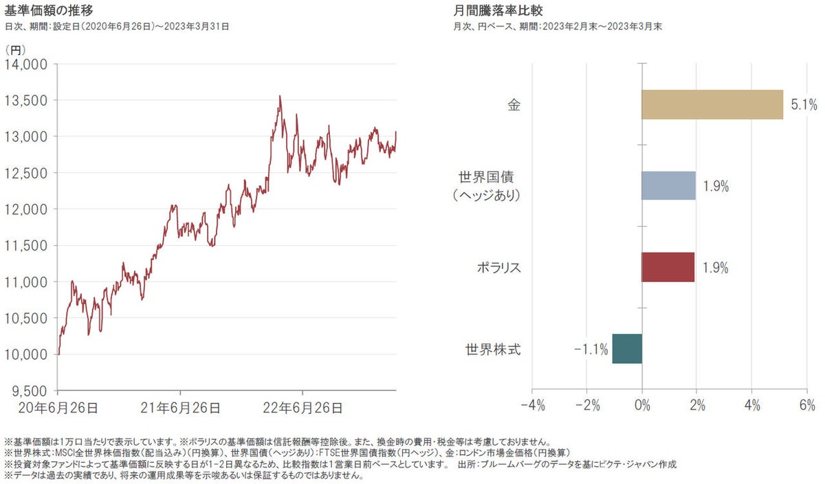 ポラリスの2023年3月31日の基準価額は13,059円となり、前月末比で244円上昇しました。なお、基準価額は前月末比で+1.9%となりました。