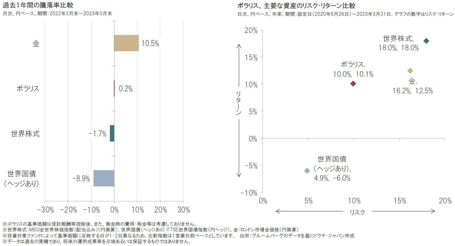 ポラリスの基準価額は過去1年間(2022年3月末~2023年3月末)では0.2%の上昇となりました。またポラリスの設定来の年率のリスク(標準偏差)とリターンはそれぞれ10.0%、10.1%となっています。
