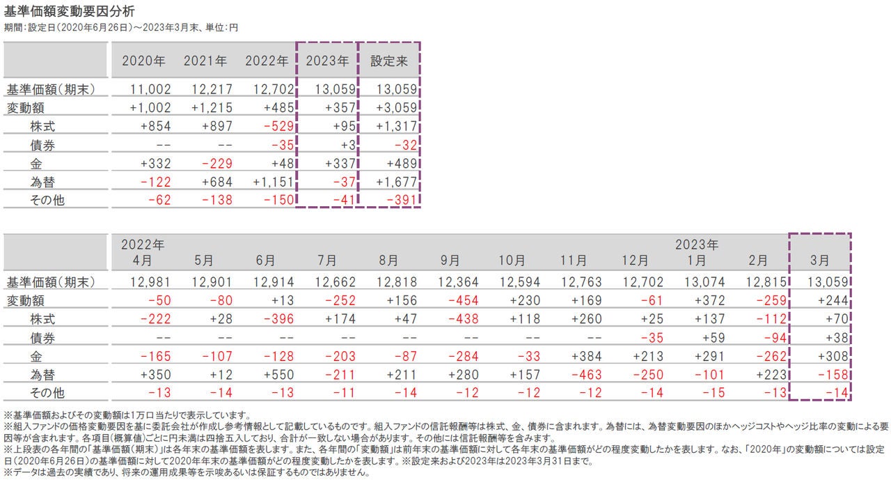 2023年3月は、為替がマイナス寄与となりましたが、株式、債券、金のプラス寄与が大きく、基準価額は上昇しました。