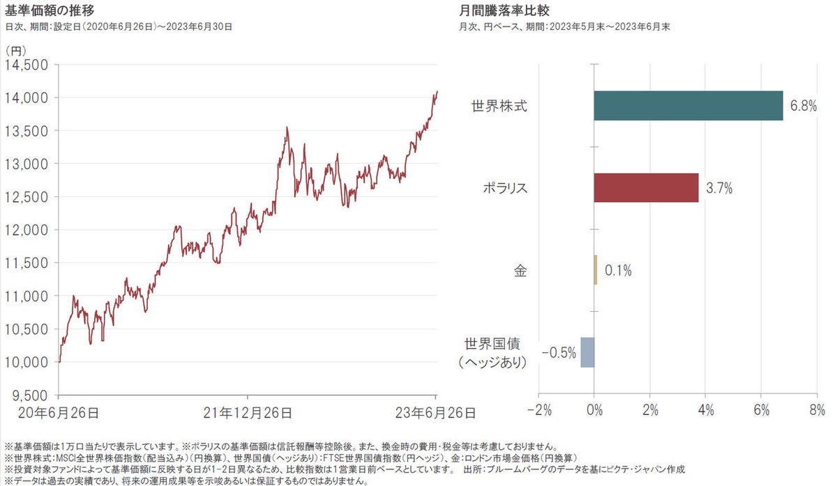 ポラリスの2023年6月30日の基準価額は14,087円となり、前月末比で507円上昇しました。なお基準価額は前月末比で+3.7%となりました。