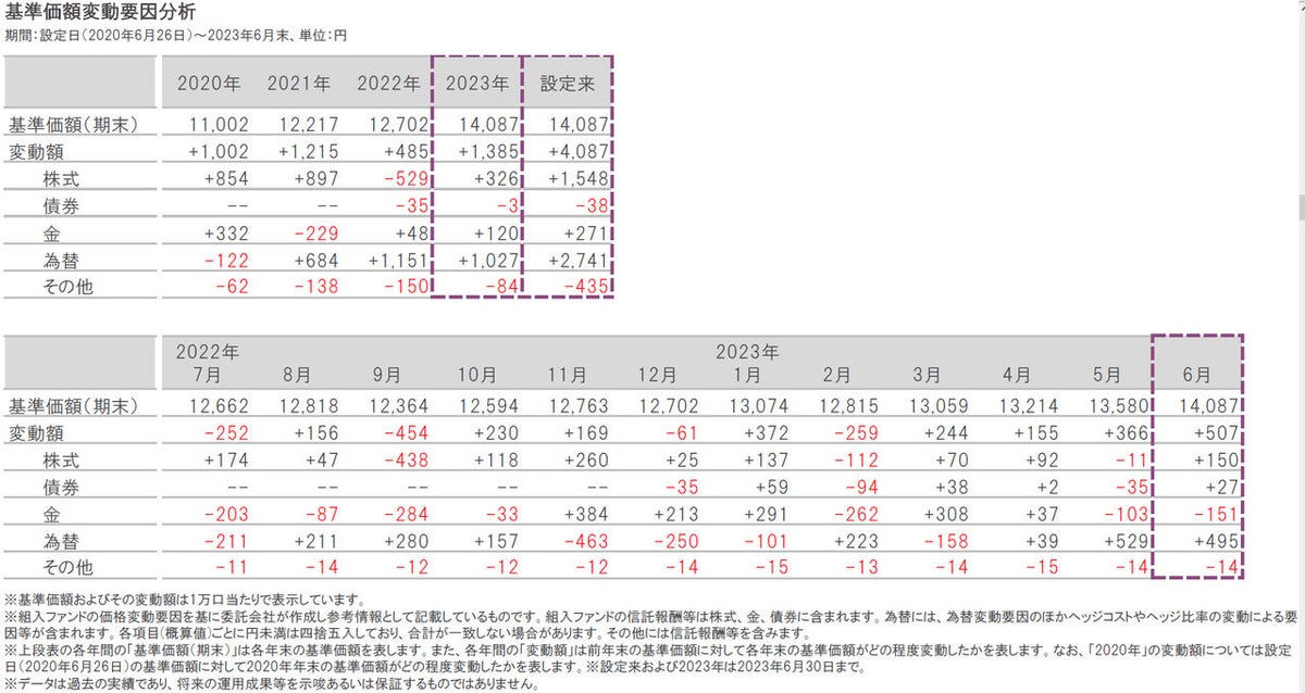 2023年6月は、金がマイナス寄与となりましたが、株式、債券、為替のプラス寄与が大きく、基準価額は上昇しました。