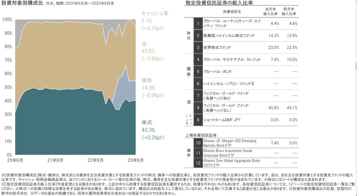 2023年6月末の組入比率は、前月末に比べ、主に金、債券を引き下げ、キャッシュ比率を引き上げました。