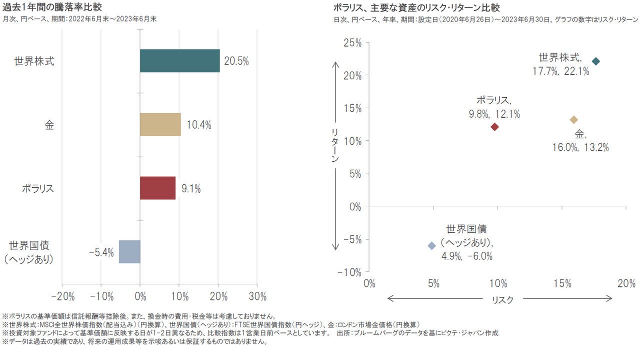 ポラリスの基準価額は過去1年間(2022年6月末~2023年6月末)では9.1%の上昇となりました。また、 ポラリスの設定来の年率のリスク(標準偏差)とリターンはそれぞれ9.8%、12.1%となっています。