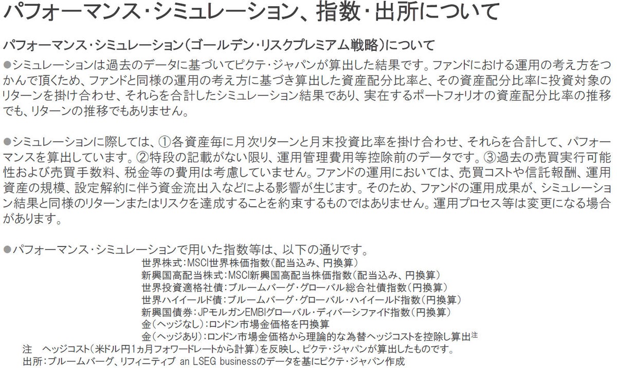 本レポートの「ゴールデン・リスクプレミアム戦略」は、株価指数などの市場データを用いた過去のシミュレーションであり、ファンドの運用実績ではありません。当シミュレーションは、すでに存在している各資産のリターンと金利の関係から過去のパフォーマンスが高くなる資産の組み合わせと、急激な市況悪化の影響を軽減できたであろう緊急手段を、それぞれ事後的に策定して計算に用いたものです。したがって、ファンドの将来の運用成果等を示唆あるいは保証するものではありません。シミュレーションの詳細や図表中に使用した指数については「パフォーマンス・シミュレーション、指数・出所について」をご参照ください。