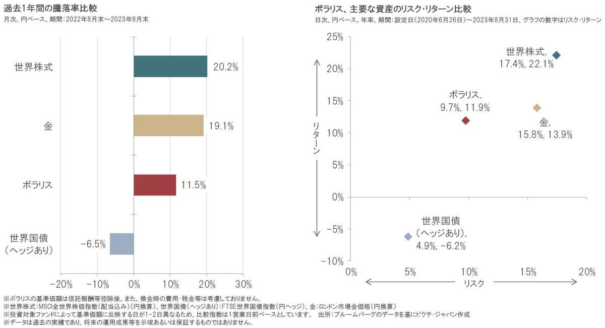 ポラリスの基準価額は過去1年間(2022年8月末~2023年8月末)では11.5%の上昇となりました。また、ポラリスの設定来の年率のリスク(標準偏差)とリターンはそれぞれ9.7%、11.9%となっています。