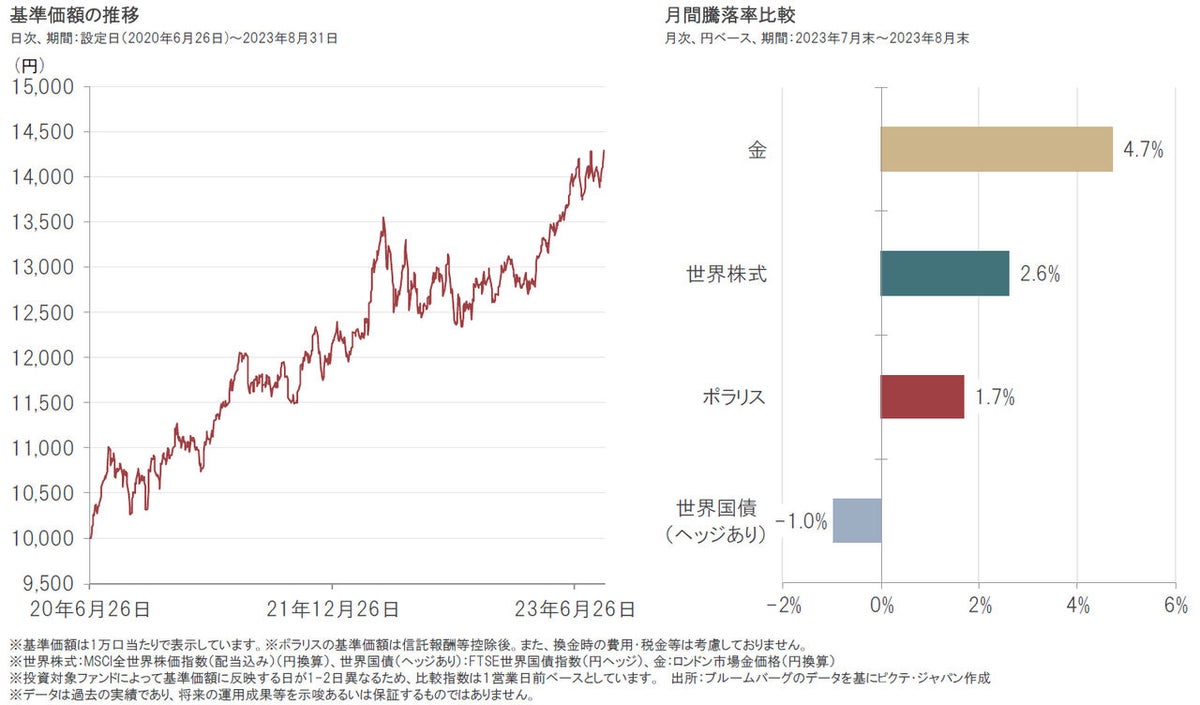 ポラリスの2023年8月31日の基準価額は14,298円となり、前月末比で238円上昇しました。なお、基準価額は前月末比で+1.7%となりました。