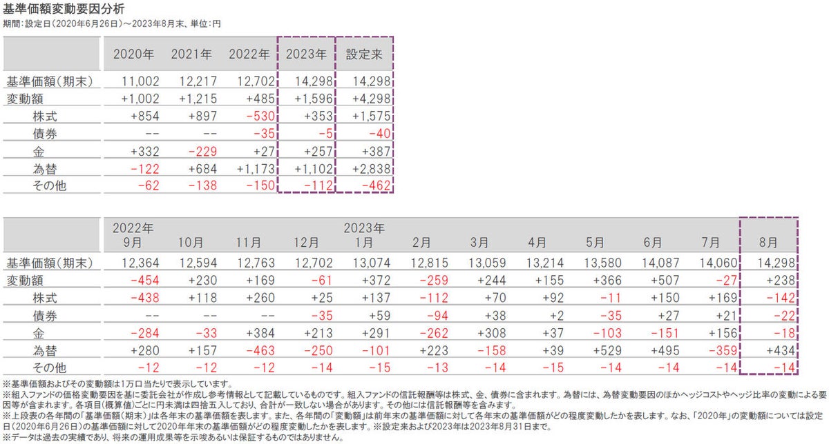 2023年8月は、現地通貨ベースで株式、債券、金がいずれもマイナス寄与となりましたが、為替のプラス寄与が大きく、基準価額は上昇しました。