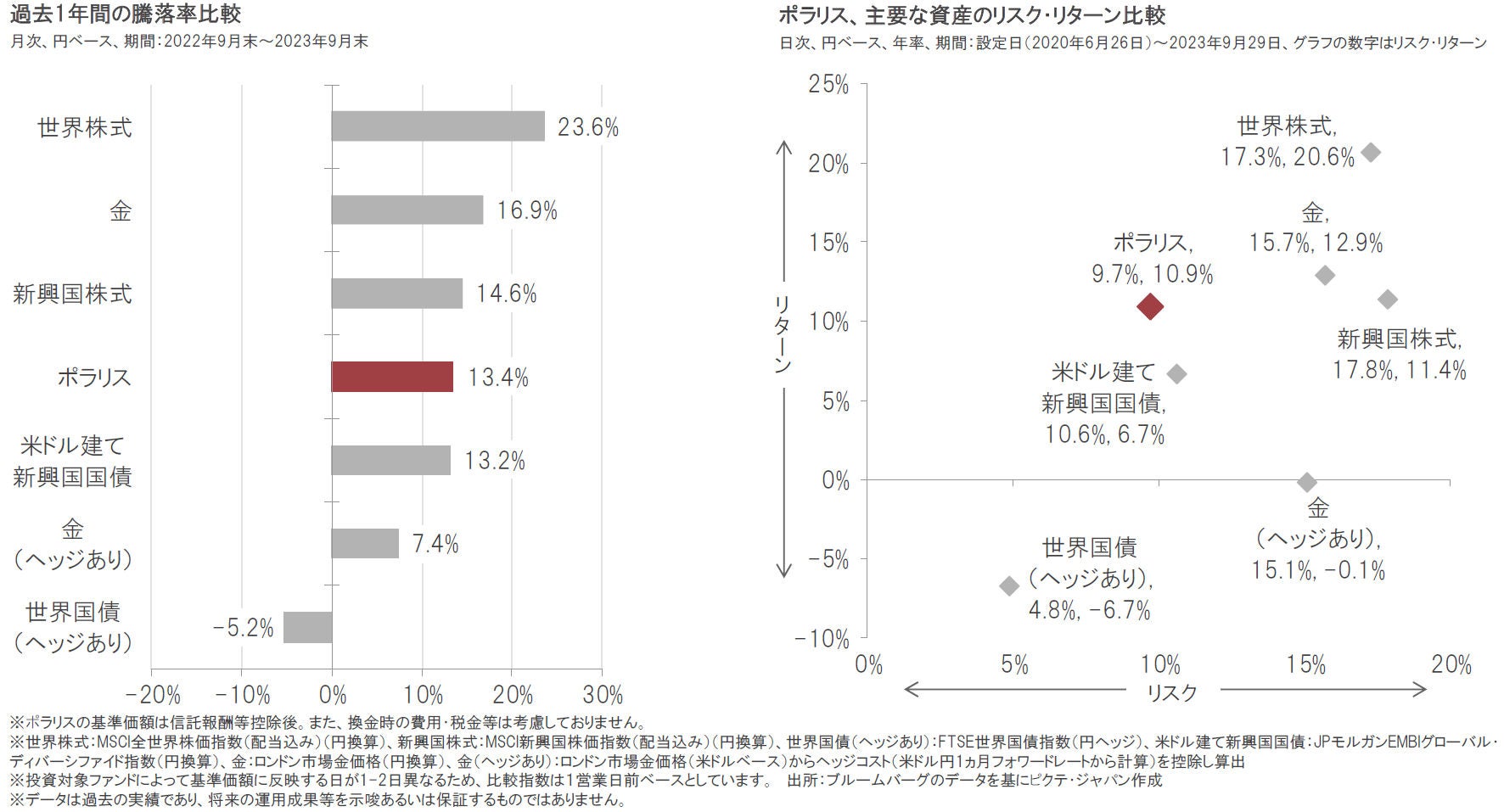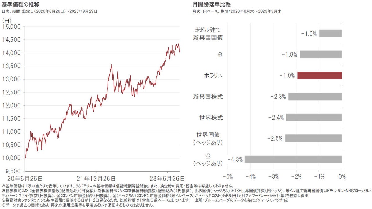 ポラリスの基準価額は過去1年間(2022年9月末~2023年9月末)では13.4%の上昇となりました。また、設定来の年率のリスク(標準偏差)とリターンはそれぞれ9.7%、10.9%となっています。