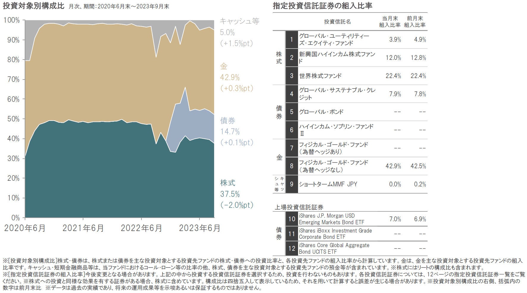 2023年9末の組入比率は、前月末に比べ株式の組入比率を引き下げ、キャッシュ等、金の組入比率を引き上げました。債券は組入比率に大きな変更はありませんでした。