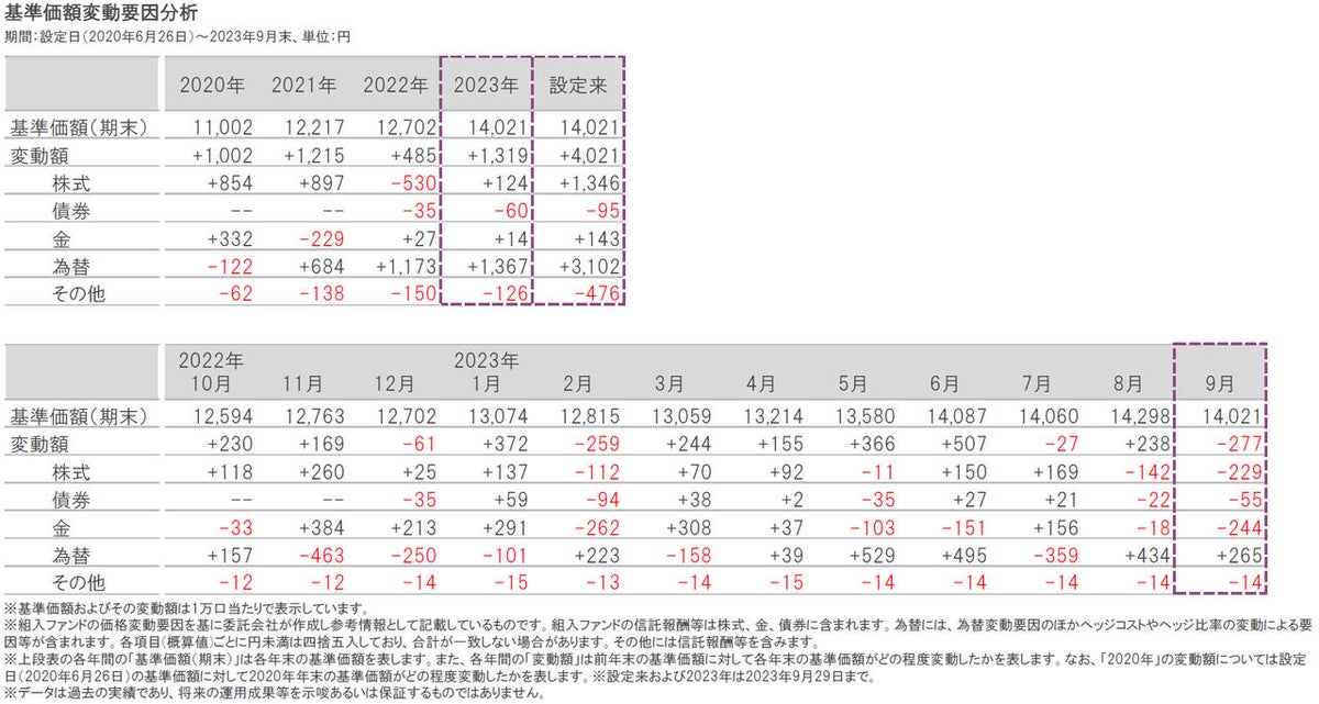 2023年9月は、為替はプラス寄与となりましたが、現地通貨ベースで株式、債券、金がいずれもマイナス寄与となり、基準価額は下落しました。