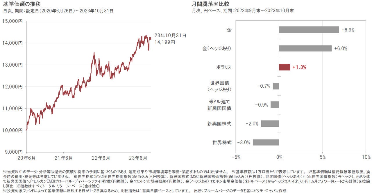 2023年10月31日のポラリスの基準価額は14,199円となり、前月末比で178円上昇(+1.3%)しました。