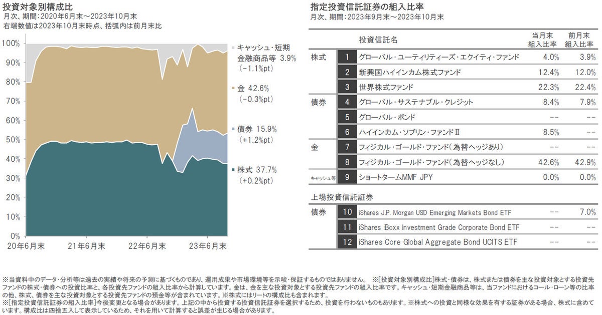 2023年10月末の組入比率は、前月末に対して、債券、株式を引き上げた一方、キャッシュ等、金を引き下げました。