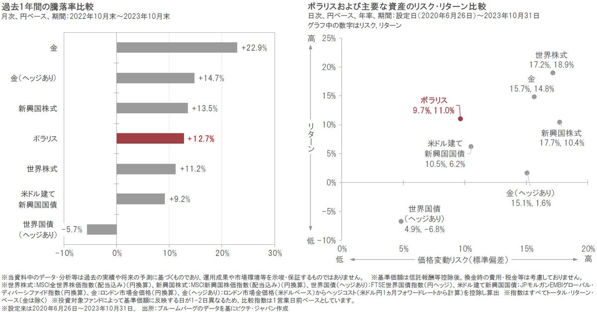 ポラリスの基準価額は過去1年間(2022年10月末~2023年10月末)で12.7%上昇しました。また、設定来の年率のリスク(標準偏差)とリターンはそれぞれ9.7%、11.0%となっています。