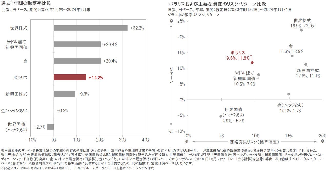 ポラリスの基準価額は過去1年間(2023年1月末~2024年1月末)で14.2%上昇しました。また、ポラリスの設定来の年率のリスク(標準偏差)とリターンはそれぞれ9.6%、11.8%となっています。