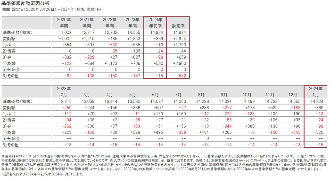 基準価額の変動要因の内訳は、1)~3)市場要因(価格、金利、信用力等の変化による株式、債券、金の変動要因)、4)為替要因、5)分配金要因、および、6)その他です。