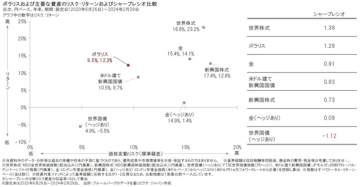 ポラリスの設定来の年率のリスク(標準偏差)とリターンはそれぞれ9.5%、12.3%となっています。