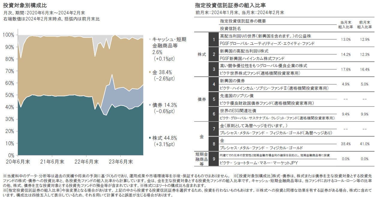 2024年2月末の組入比率は、前月末に対して、株式、キャッシュ等を引き上げた一方、金、債券を引き下げました。