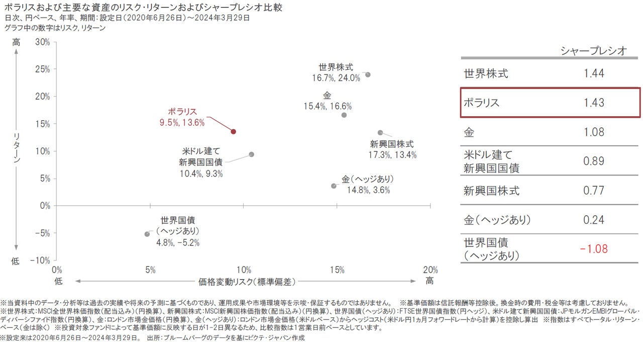 ポラリスの設定来の年率のリスク(標準偏差)とリターンはそれぞれ9.5%、13.6%となっています。