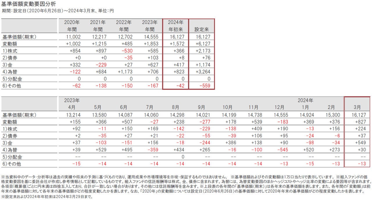 基準価額の変動要因の内訳は、1)~3)市場要因(価格、金利、信用力等の変化による株式、債券、金の変動要因)、4)為替要因、5)分配金要因、および、6)その他です。