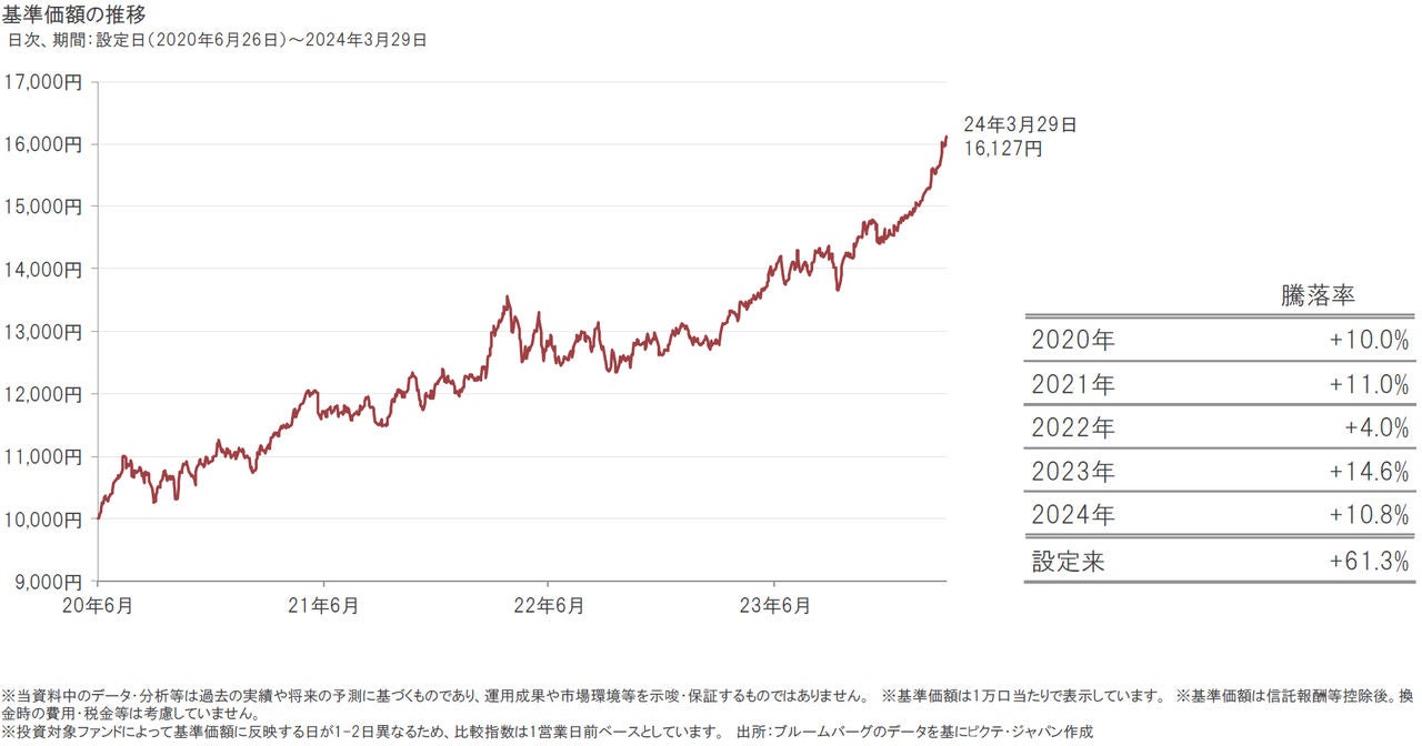 2024年3月29日のポラリスの基準価額は16,127円となり、設定来で+61.3%、年初来で+10.8%上昇しています。