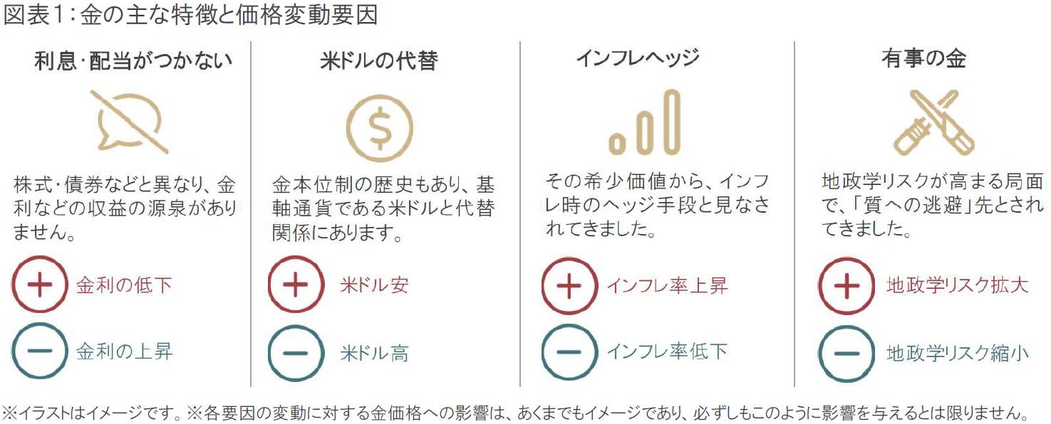 設定来、ポラリスが注目して積極的に投資してきた金ですが、金価格の変動について代表的な特徴を踏まえて整理したものが、図表1(金の主な特徴と価格変動要因)です。金の価格は、金利や通貨の動向、景気やインフレ、国際情勢など多岐にわたる要因が、その時々の状況によって影響の度合いを変えながら変動しています。