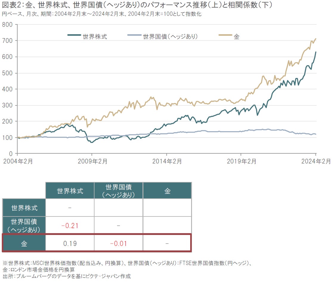 金は株式や債券などの他資産と異なる値動きをする傾向があります。資産間の動きの関連性を示す相関係数を過去20年間(2004年2月末~2024年2月末)でみると、金と世界株式は0.19で低相関、金と世界国債(ヘッジあり)はー0.01で逆相関となっています(図表2下)。資産間の相関が逆相関の場合はそれぞれの資産が逆の動きをする傾向があること、相関が低い(ゼロに近い)場合は価格の動きに関連性が小さいことを意味しています。