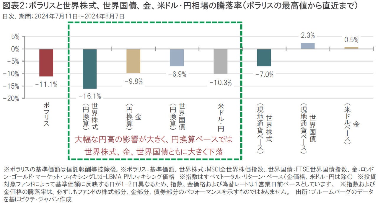 市場環境に応じて、魅力的なリスクプレミアム注が期待できる資産を選択し投資するポラリスは、2024年7月末時点で、株式、金、債券に投資しており、その多くが外貨建てとなっています。そのため、今回の大幅な円高と株式市場の調整により、為替と株式がポラリスの基準価額の主な下落要因となりました(図表1参照)。